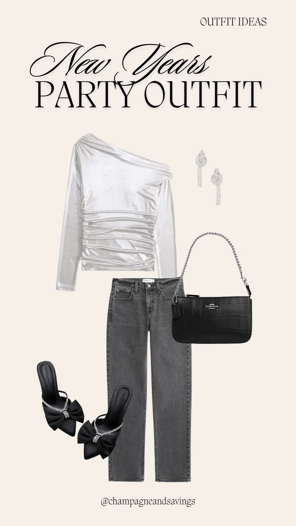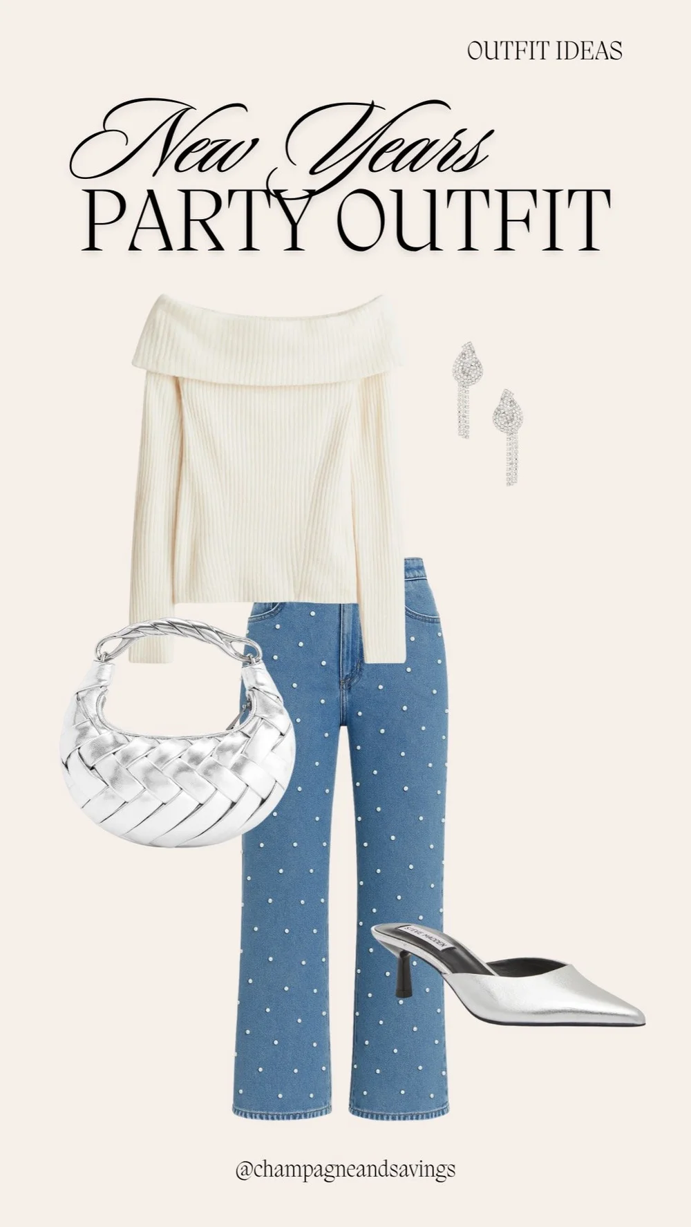 Perfeito se você estiver mantendo -o aconchegante, mas ainda quiser se sentir festivo. Os detalhes da pérola no jeans são sutis glamouros. Saltos prateados e uma bolsa brilhante fazem com que seja pronto para NYE.