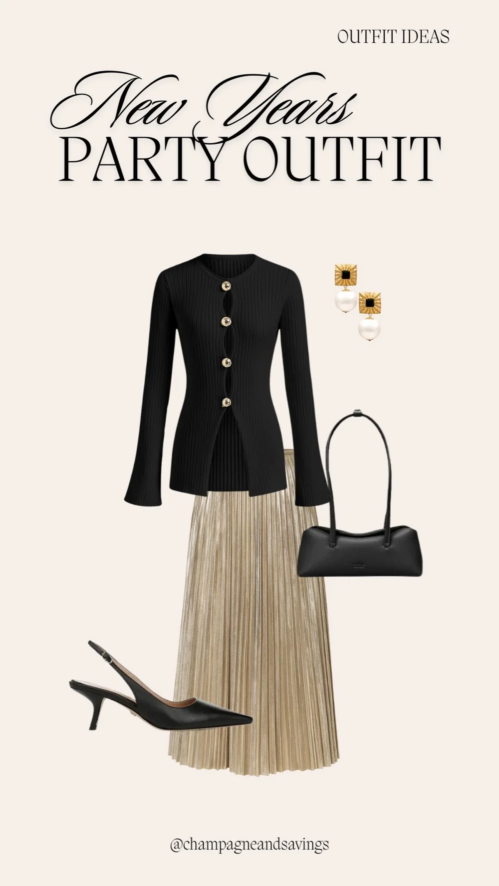 A saia dourada plissada faz com que essa aparência pareça festiva, mas a blusa preta o mantém elegante. Está dando dinheiro velho e eu adoro isso.