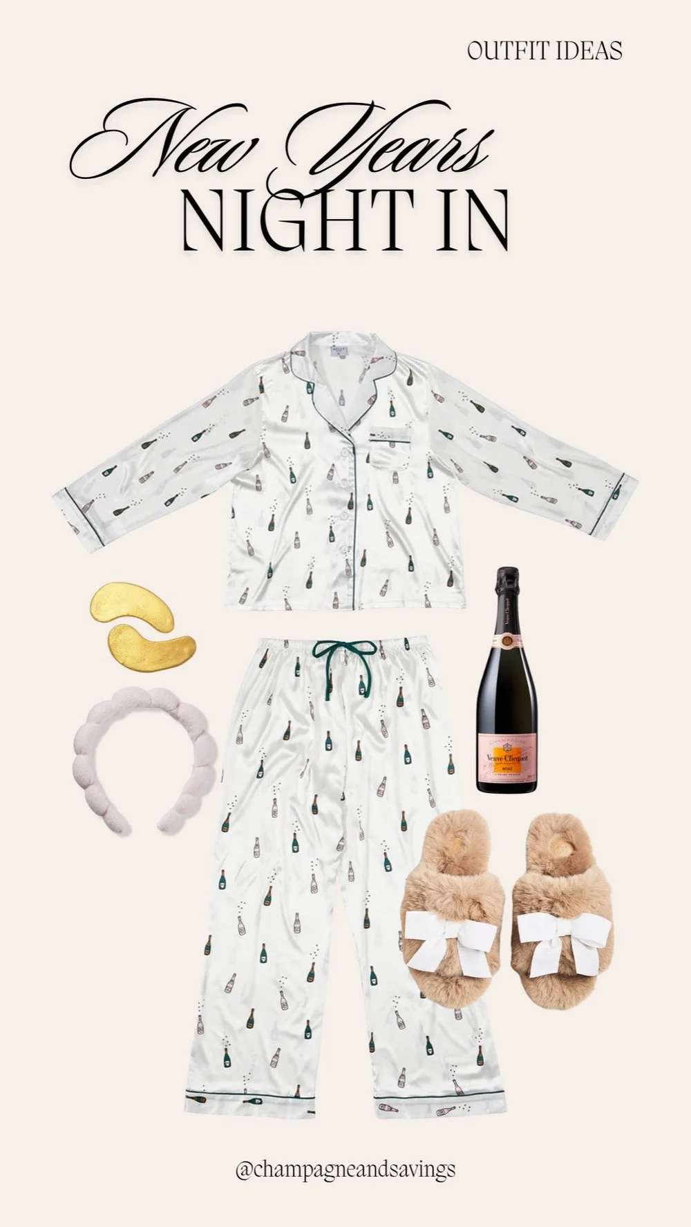 Não saindo de casa? Mesmo. Pijamas impressas de champanhe fofas, chinelos fofos e uma garrafa de borbulhante são tudo o que você precisa. Adicione um pequeno momento de cuidados com a pele e chame de festa.