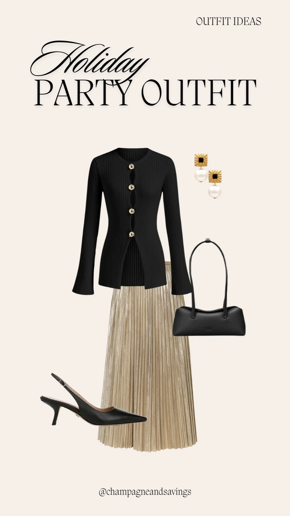 Ame como este mistura texturas. É simples, mas parece super put-together. Uma saia metálica plissada faz com que qualquer coisa pareça elegante. Um cardigã equipado equilibra.