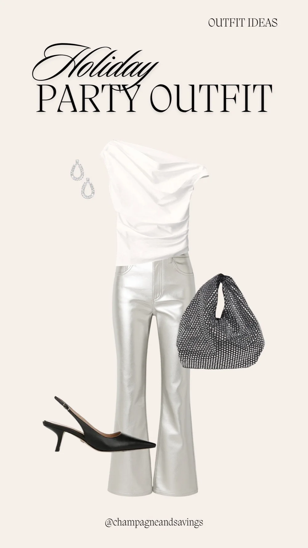 Esse visual é legal e limpo. As calças metálicas parecem ousadas, mas ainda vestíveis. O topo assimétrico o mantém elegante. Adicione os saltos pretos e uma bolsa brilhante para amarrar tudo.