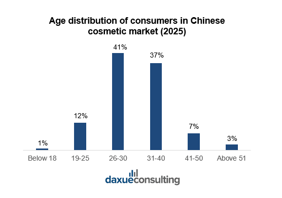 A estrutura demográfica reforça ainda mais esta dinâmica. Consumidores de 26 a 30 anos (41,0%) e 31–40 (36,8%) dominam o consumo de cosméticos, reflectindo níveis de rendimento estáveis e uma ênfase crescente na funcionalidade e na credibilidade da marca. Enquanto isso, os consumidores mais jovens, com idades entre 19 e 25 anos, embora em participação menor (11,6%), apresentam taxas de experimentação mais altas e maior sensibilidade ao design e à estética das tendências.