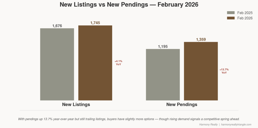 Na prática, isso significa que você está navegando em um mercado dividido e sua estratégia precisa refletir isso. As casas com 60, 70, 90 dias? Muitos deles são superfaturados, pouco apreciados ou ambos – e estão aumentando essa média. Mas a casa com bom preço e boa apresentação em um bairro desejável ainda atrai urgência. Com 1.359 novas pendências contra 1.745 novas listagens – uma proporção de pendências para listagem de cerca de 78% – há uma absorção real acontecendo. Fique pronto, pré-aprovado e, quando algo bom acontecer, trate-o como se ainda fosse um mercado competitivo. Porque para aquela casa, é.