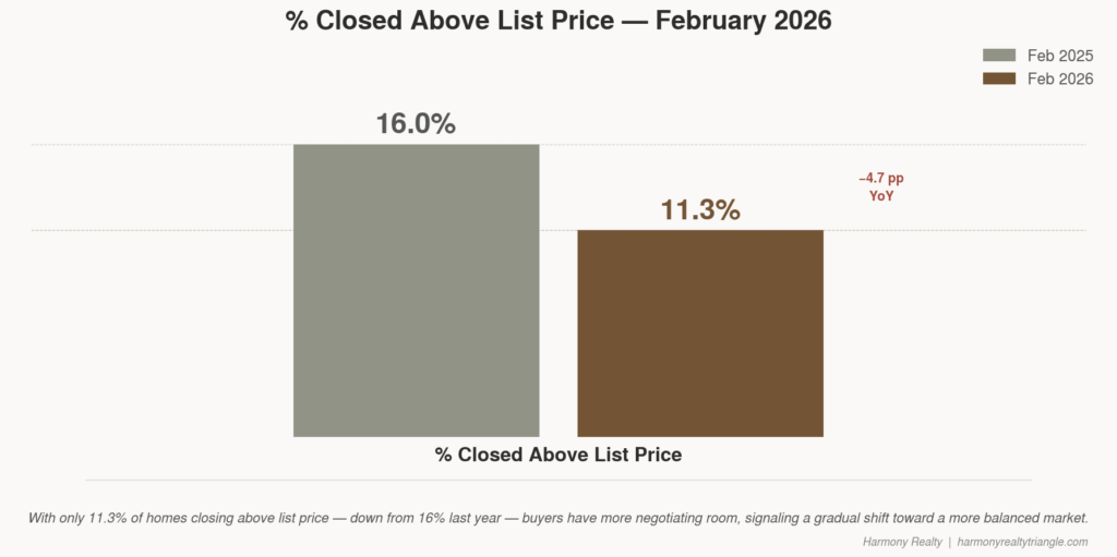 O mercado está contando uma história muito honesta neste momento, e os vendedores que estão ouvindo estão indo bem. As casas ainda estão fechando a 98,3% do preço de tabela, em média, e 11,3% dos fechamentos estão acontecendo acima do preço de tabela. Esse não é um mercado em dificuldades – é um mercado funcional. Mas compare isso com a época do ano passado, quando 16% das casas fecharam acima da lista e os vendedores recebiam 98,9% do preço de tabela, e você pode sentir a mudança. O limite máximo caiu e a precisão dos preços é mais importante do que há doze meses.