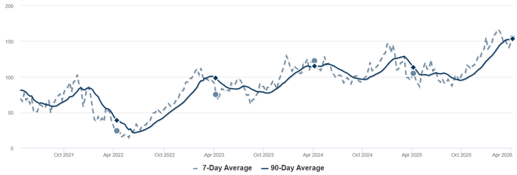 A média atual de 154 é significativamente superior aos 104 dias observados nesta altura do ano passado, aos 122 dias em 2024 ou aos 75 dias em 2023. No entanto, com sinais de autocorreção nos restantes dados, devemos ver estes números regressarem a níveis mais próximos do normal.