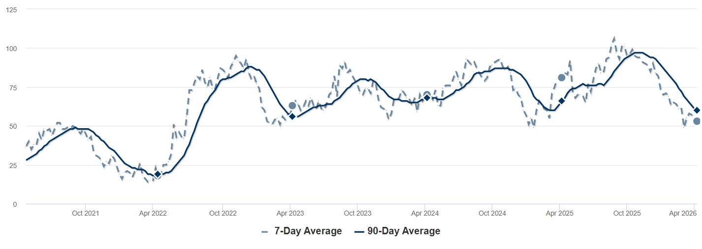 Durante esta época do ano em Newberb, normalmente inventariamos tendências que refletem a média de Portland: um declínio do outono para a primavera, seguido por uma subida da primavera para o outono seguinte. Estamos vendo esse padrão se repetir este ano, mas a Newberg está passando por uma queda mais acentuada nos estoques do que nos últimos três anos. Em 10 de abril, o número total de casas à venda era de 53, significativamente inferior ao total de 81 do ano passado e inferior (mas mais próximo) dos totais da década de 60 vistos nos dois anos anteriores.
