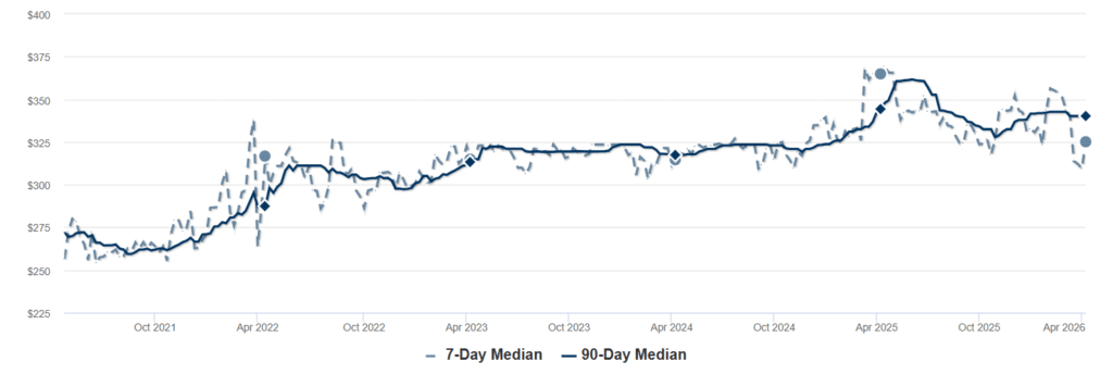 Determinamos os preços médios das casas com dados de preço por metro quadrado, a métrica mais confiável para comparar o valor de mercado em Portland. Para o último período que termina em 10 de abril, o preço por metro quadrado em Newberg é de US$ 325. Ao analisar os dados históricos, o preço atual por pé quadrado de Newberg é inferior a US$ 365 em 2025, mas notavelmente superior aos US$ 315 registrados em 2024 e 2023.