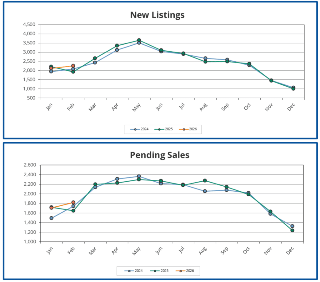 De acordo com os dados mais recentes do RMLS de fevereiro de 2026, Portland viu um aumento de 17,1% em novas listagens em comparação com 2025 (2.260 vs. 1.930, respectivamente). Este fluxo de estoque foi acompanhado por um aumento de 10,5% nas vendas pendentes (1.821 vs. 1.648).