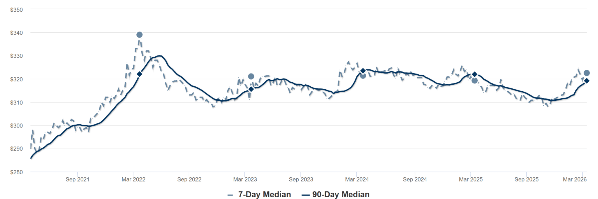O preço por metro quadrado – nosso método preferido para entender valores em Portland – subiu para US$ 322 no final de março. Esta é uma melhoria em relação aos US$ 319 que vimos em 2025, alinhando-se com 2023 e 2024.