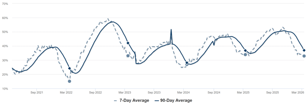 As reduções de preços são um indicador chave da saúde do mercado. Atualmente, 32,93% das casas no mercado registaram uma diminuição de preços, perto dos 33,93% desta época do ano passado. Este movimento ligeiramente descendente durante um período de estoques elevados sugere que os vendedores estão permanecendo realistas com os preços de tabela. Sempre que as diminuições se estabilizam ou diminuem, muitas vezes sinalizam um piso nos preços e um mercado mais previsível para compradores e vendedores.