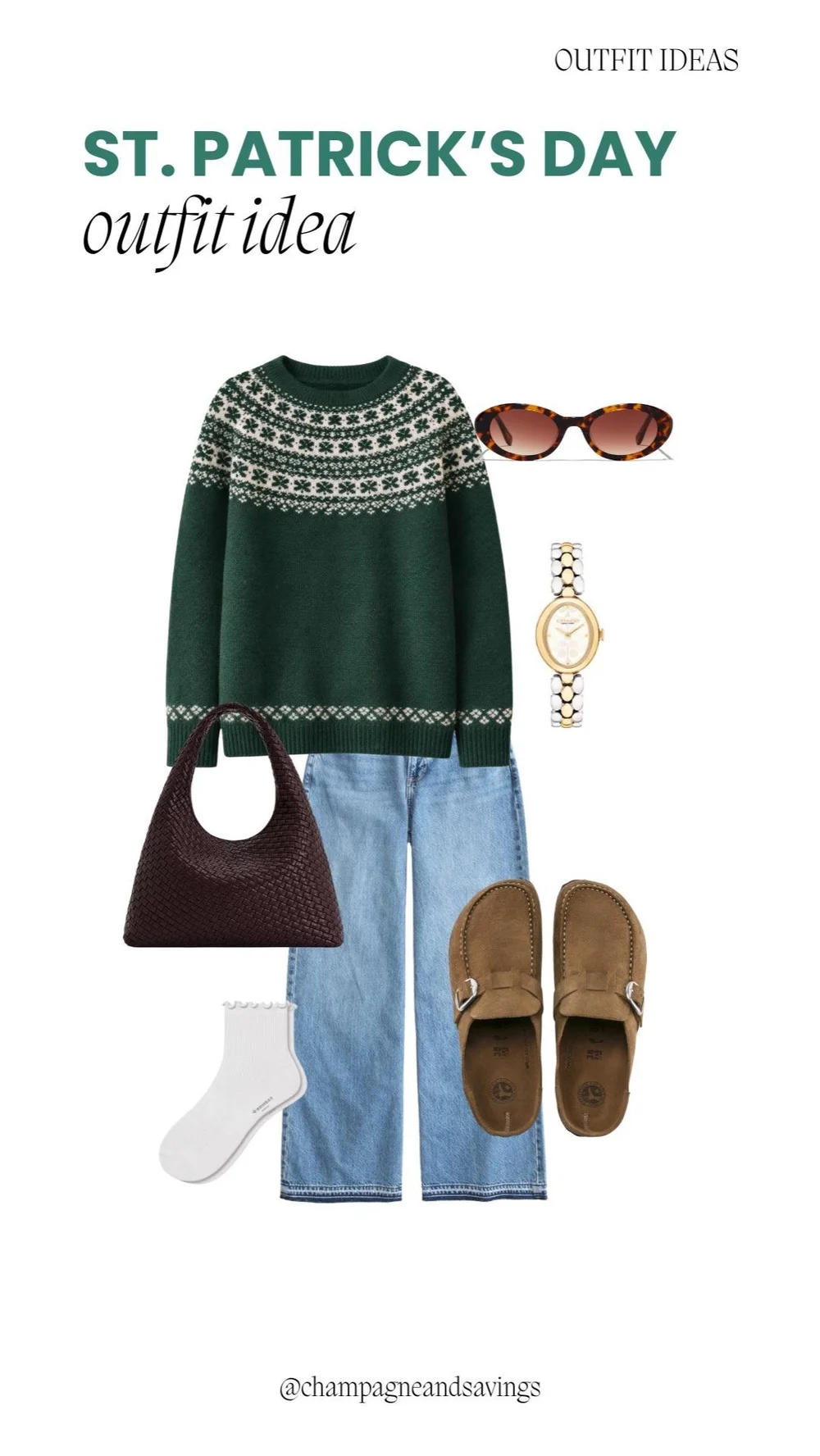 Esse look é a definição do estilo descomplicado do Dia de São Patrício. O suéter verde profundo combinado com jeans clássicos de perna reta parece festivo sem uma roupa temática gritante. Adicione tamancos confortáveis ​​e acessórios neutros e você estará pronto para planos para o dia todo.
