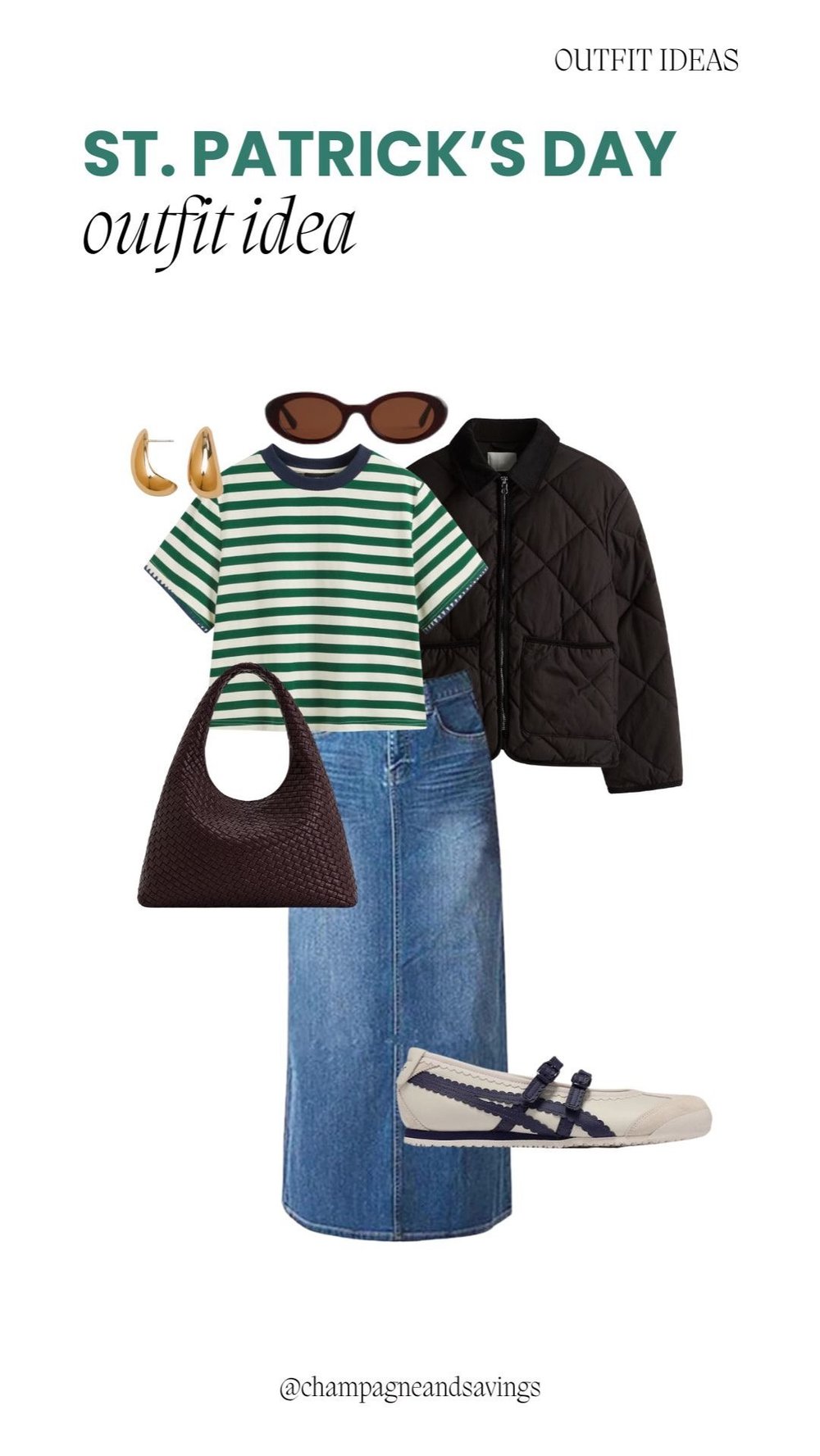 As listras verdes são feitas basicamente para o Dia de São Patrício. Combinado com saia midi jeans e tênis, esse look parece casual, mas com estilo intencional. A jaqueta acolchoada adiciona calor suficiente para o início da primavera.