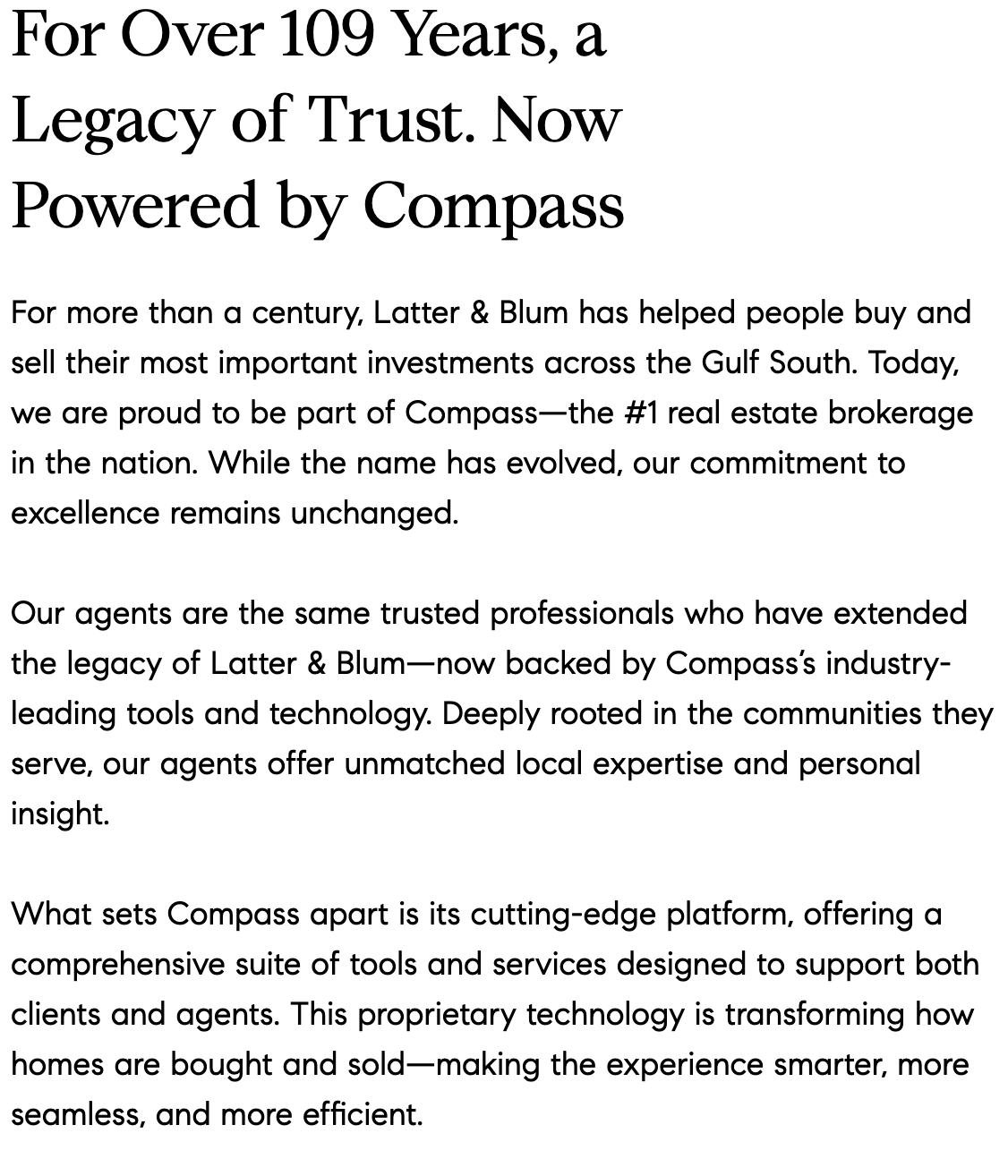 “Nossos agentes são os mesmos profissionais confiáveis que estenderam o legado de Last & Blum-agora apoiados pelas ferramentas e tecnologia líder do setor da Compass”, afirma a página.