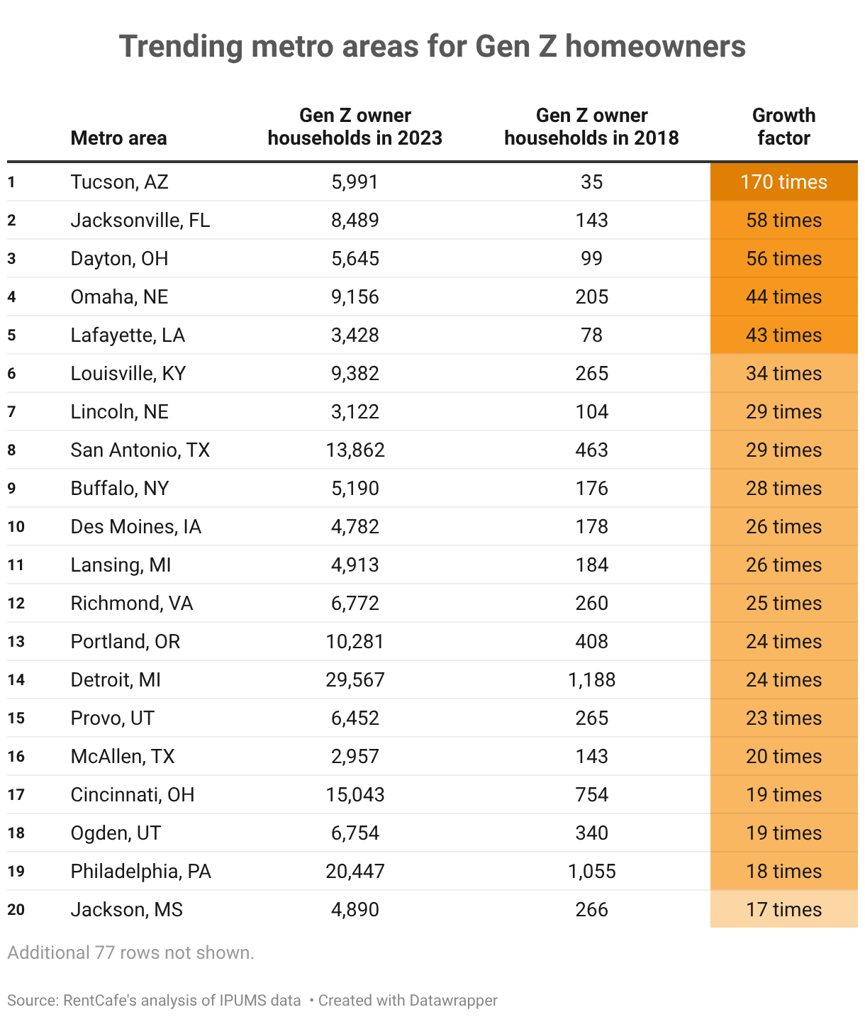 Entre as 97 áreas metropolitanas estudadas, 10 têm mais de um quarto da Geração Z possuindo uma casa. Ogden, Utah, lidera com aproximadamente 41%, auxiliado pela proximidade de Salt Lake City e pelos programas locais de assistência à aquisição de casa própria. Detroit segue com um terço dos jovens adultos possuindo casa depois que o número de domicílios ultrapassou 29.500. Birmingham, Alabama, e Jackson, Mississippi, registam 30% cada, impulsionadas por rendimentos que mais do que triplicaram. Greenville, na Carolina do Sul, aparece em seguida, com cerca de 28%.